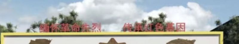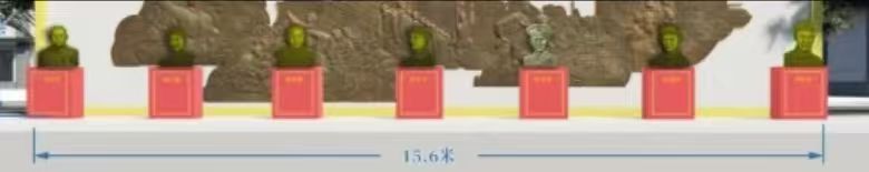 人物胸像、軍旗旗幟和不銹鋼立體字。